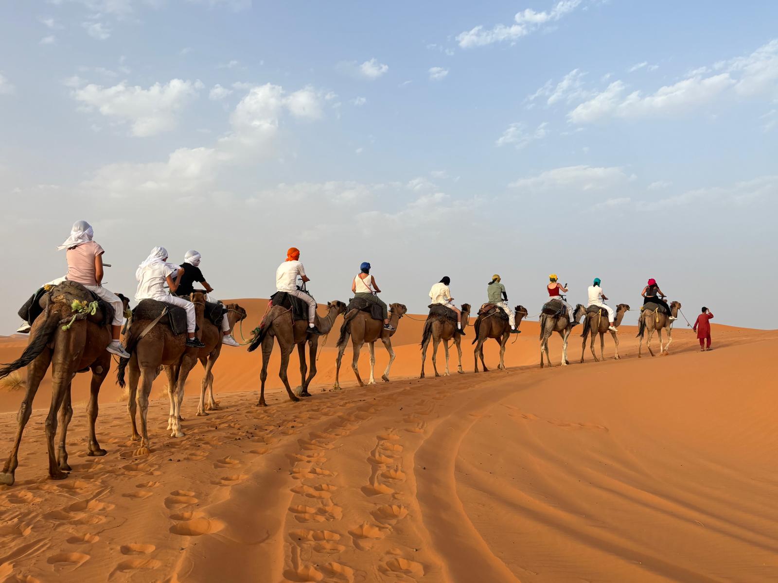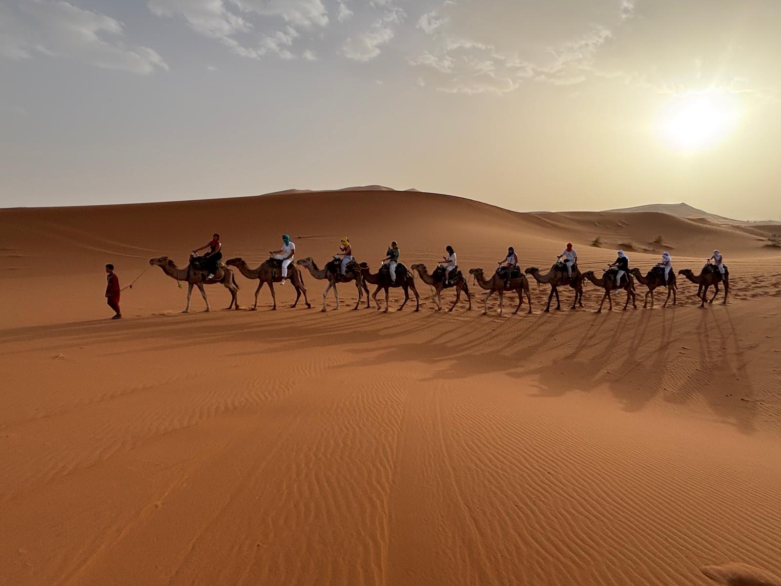 Tras el desayuno, pondremos rumbo a las espectaculares Gargantas del Todra, rodeadas de palmerales y paredes rocosas de más de 300 metros de altura. Después continuaremos hacia Erfoud, famosa por sus fósiles y dátiles, y haremos una parada en el mercado tradicional de Rissani. Finalmente, llegaremos a Merzouga, puerta del desierto del Erg Chebbi, donde montaremos en dromedarios para adentrarnos en las dunas. Al llegar al campamento en jaimas, disfrutaremos de una cena bereber y música de tambores bajo un cielo estrellado.